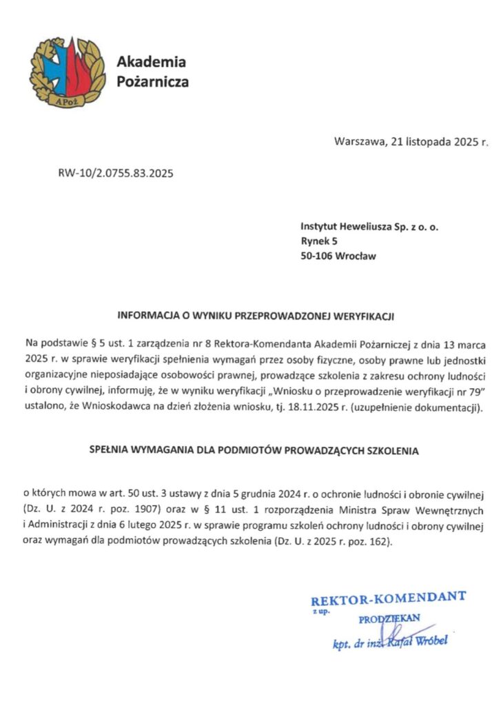 Uzyskaliśmy pozytywną weryfikację Akademii Pożarniczej w zakresie spełnienia wymogów dla podmiotów prowadzących szkolenia z obszaru OC/OL – ochrony ludności i obrony cywilnej, o których mowa w Ustawie z dnia 5 grudnia 2024 r. o ochronie ludności i obronie cywilnej (Dz.U. z 2024 r., poz. 1907) oraz w projekcie rozporządzenia MSWiA w sprawie programów szkoleń z zakresu ochrony ludności i obrony cywilnej oraz wymagań dla podmiotów prowadzących szkolenia.